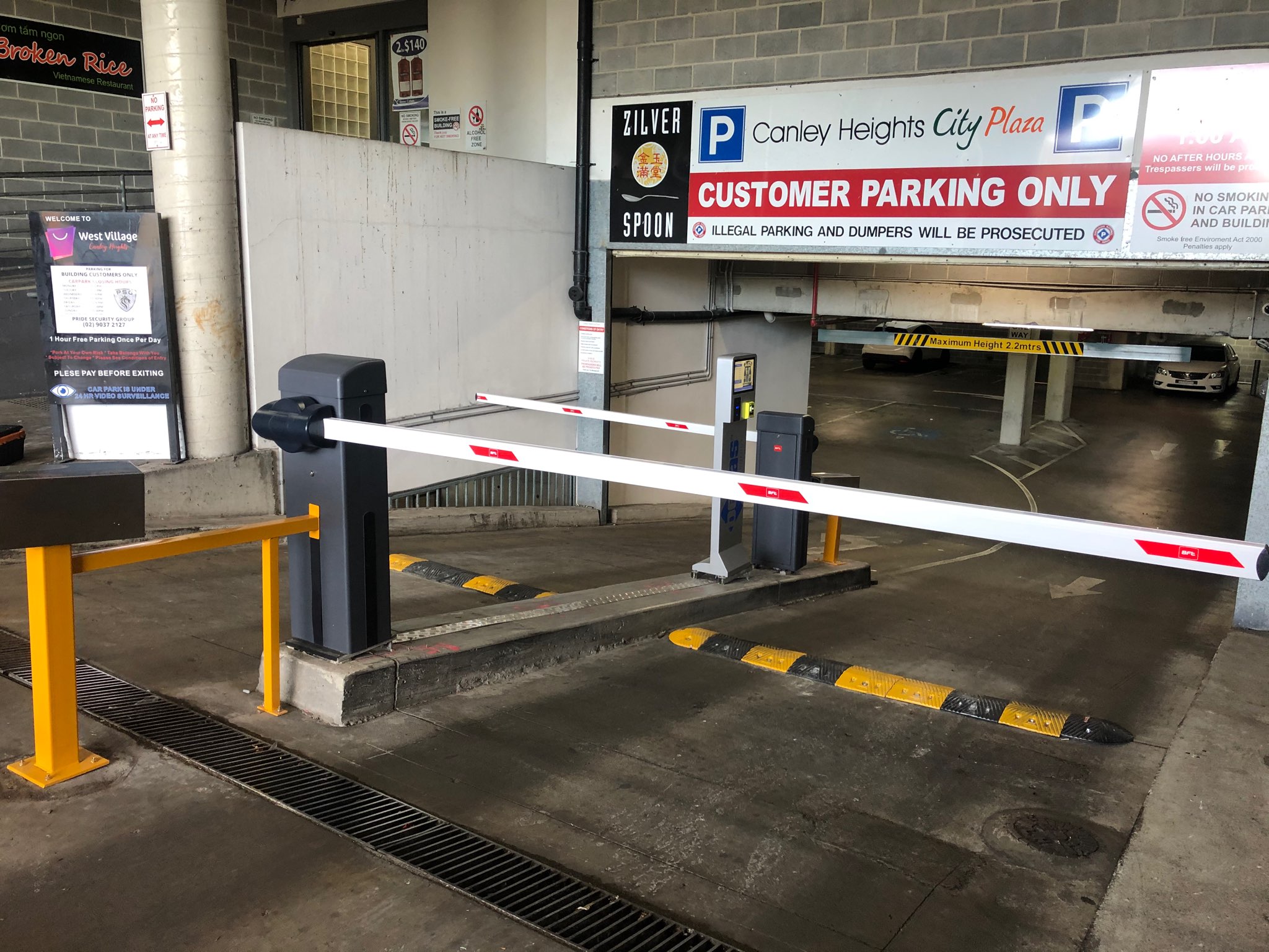 A retail precinct running a 1-in & 1-out PARCS system. LPR-controlled single-lane entry and exit manages vehicle flow across the site, keeping the car park available for shoppers and visitors.